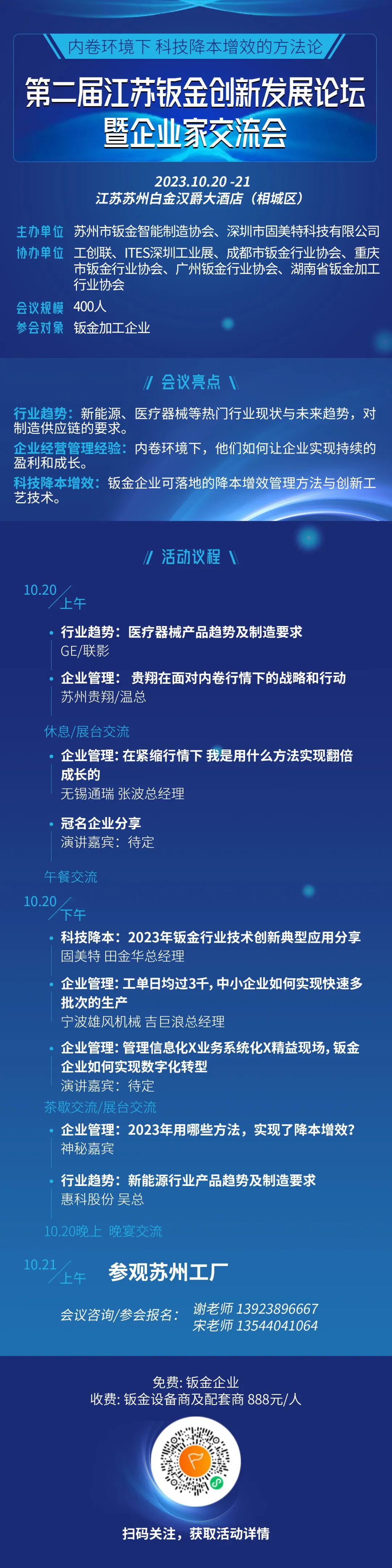 別急,就在10月20日,在蘇州,《第二屆江蘇鈑金行業(yè)論壇》,我就帶你們認(rèn)識(shí)8家企業(yè),聽他們是如何穿越周期,降本增效,逆勢(shì)增長的。